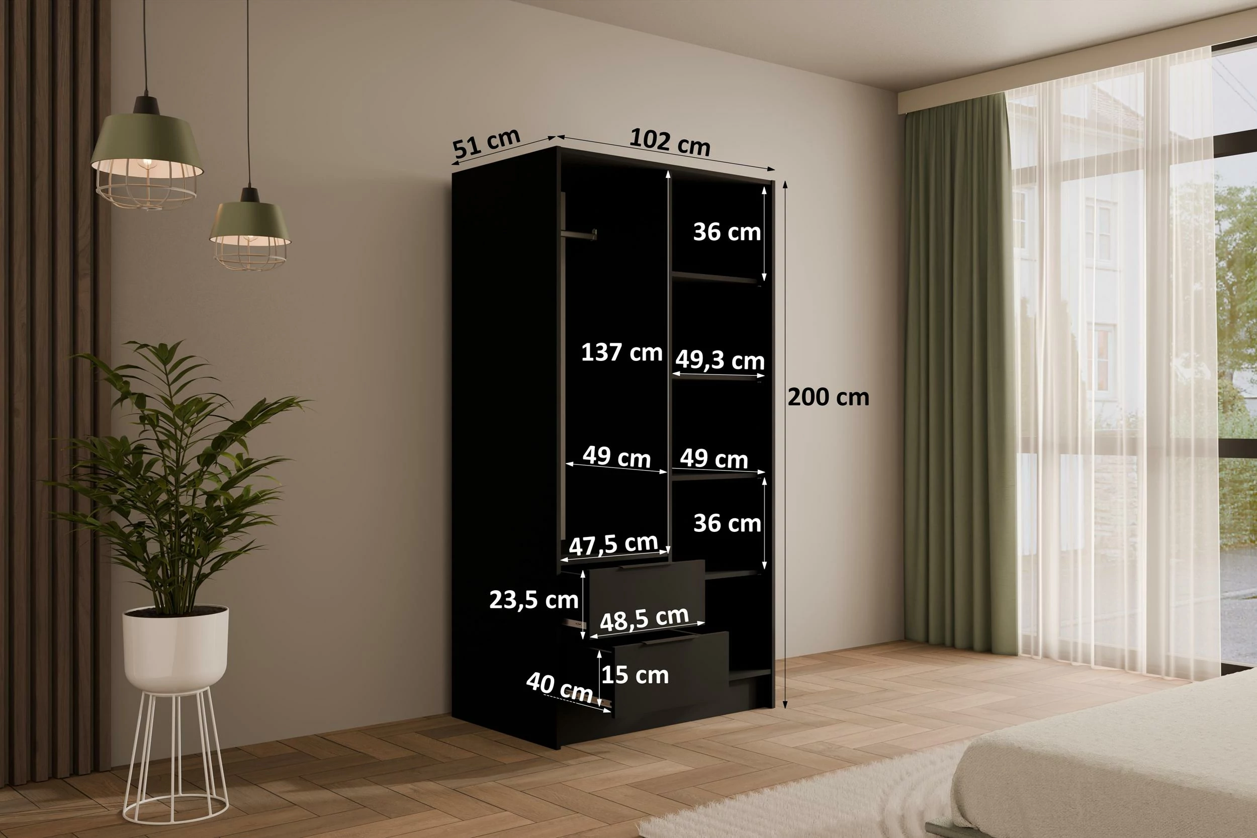 Schwarz 102 cm x 51 cm x 200 cm