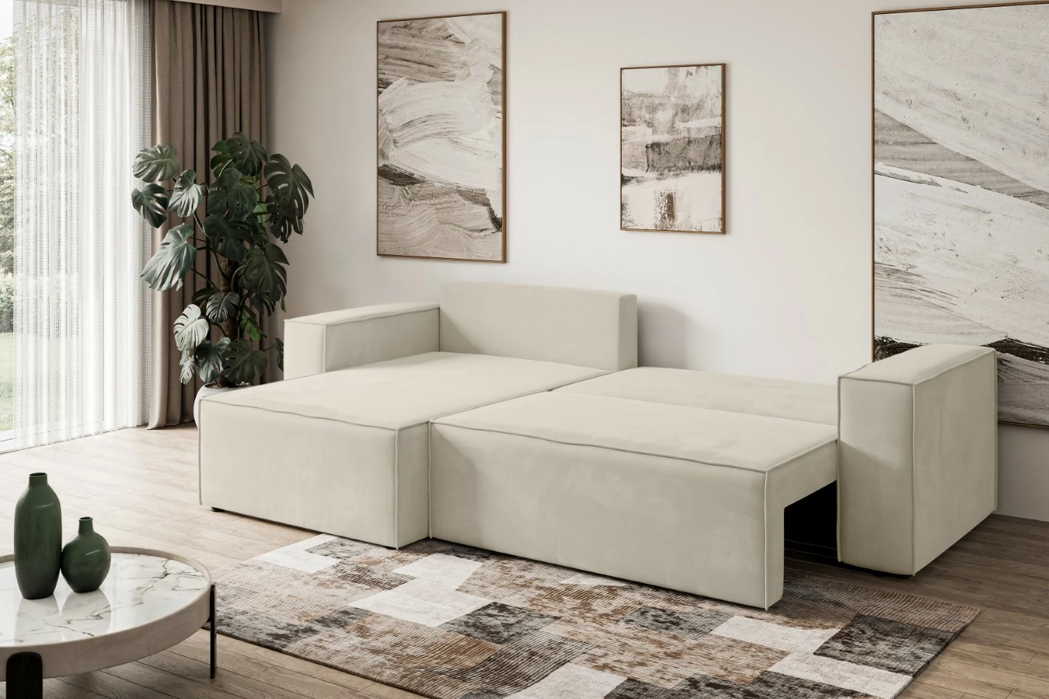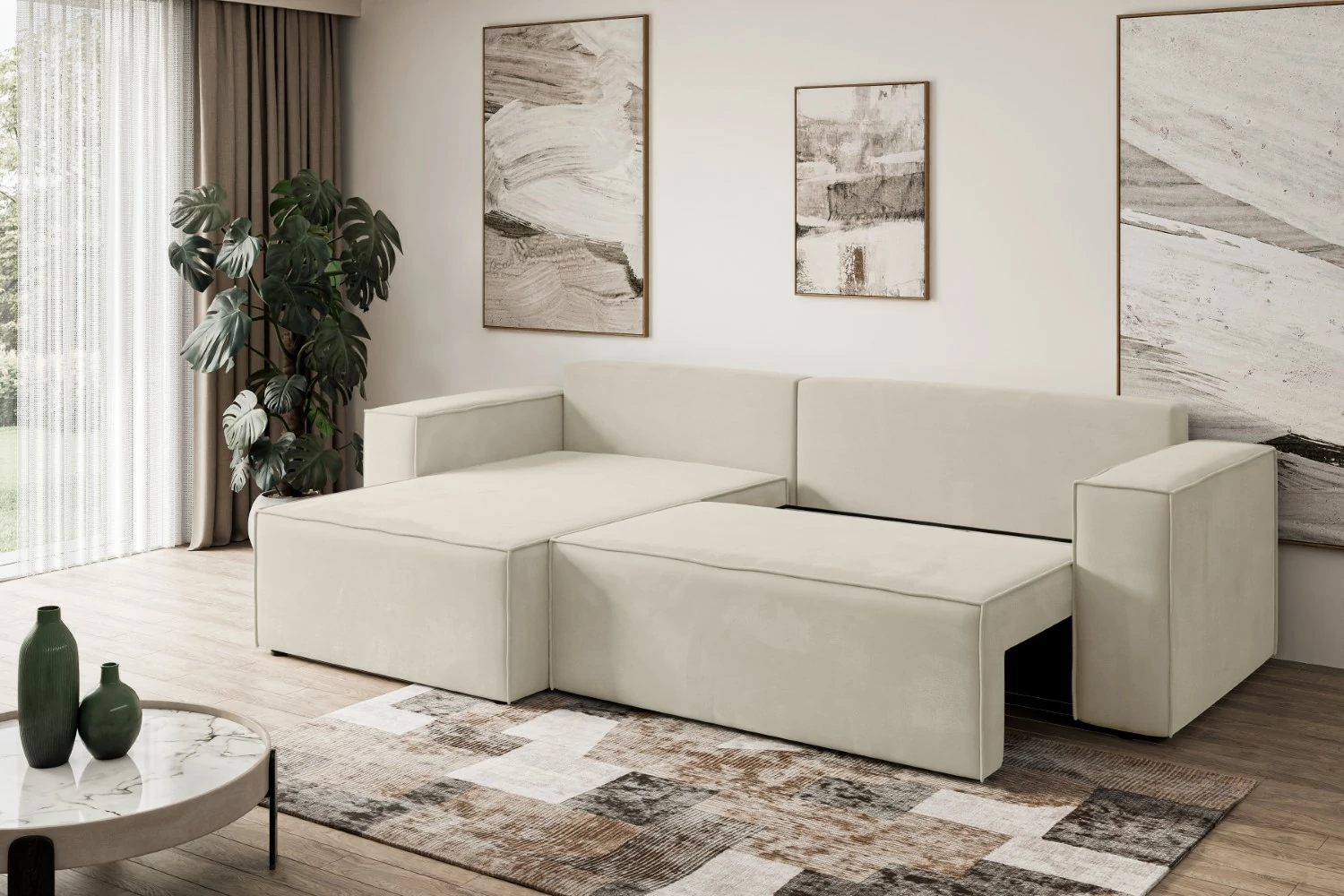 Dieses ausziehbares Eckschlafsofa für Ihr Zuhause überzeugt durch hochwertige Verarbeitung und durchdachte Technik. Der solide Auszugsmechanismus verwandelt das Sofa im Handumdrehen in ein komfortables Polstersofa-Gästebett. Perfekt für spontanen Besuch, gemütliche Filmabende oder den täglichen Einsatz als Schlafcouch.