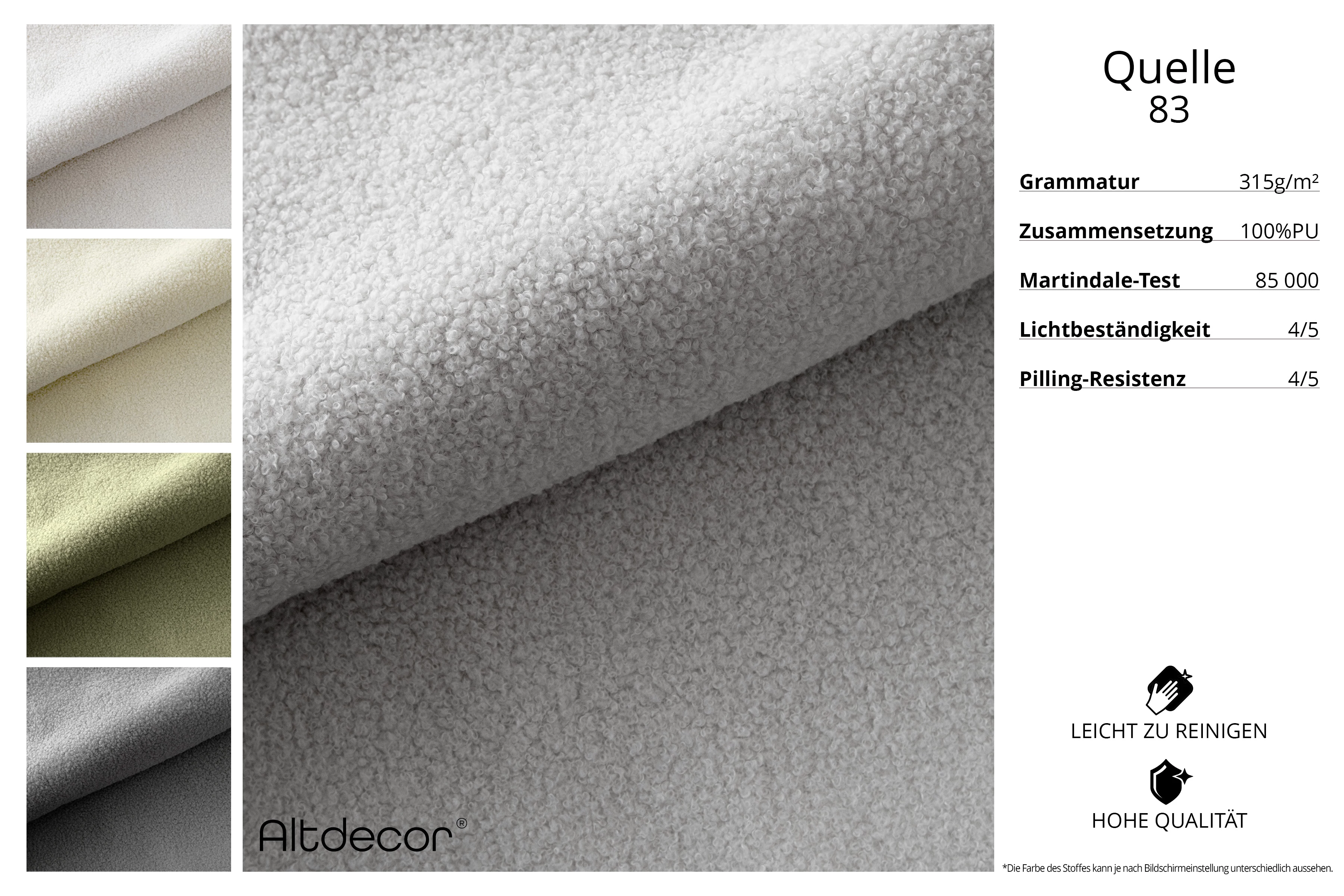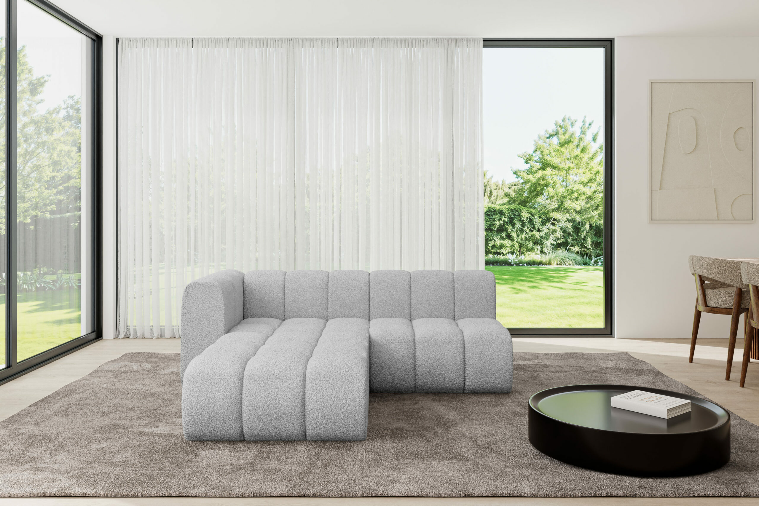 Der hochwertige Bezugsstoff überzeugt durch seine angenehme Haptik, Pflegeleichtigkeit und Strapazierfähigkeit – perfekt für den Alltag. Die rundum bezogene Rückenfläche ermöglicht eine freie Platzierung im Raum und macht das Sofa auch als Raumteiler zu einem echten Blickfang.
