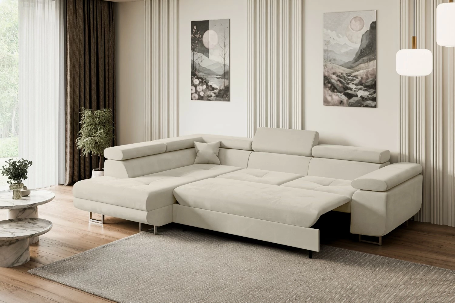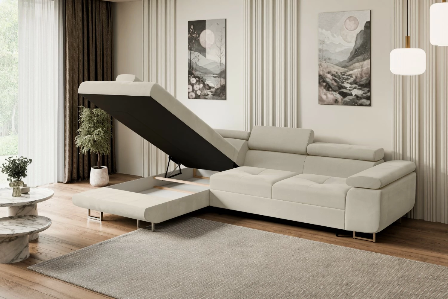 Dank der bequemen Kissen ist das Sofa ideal, um entspannte Stunden mit Familie oder Freunden zu genießen. Eine robuste Grundlage aus Möbelplatte und Massivholz garantiert die notwendige Stabilität des gesamten Möbelstücks. Die gemütliche Eckschlafsofa ist mit einem praktischen Bettkasten ausgestattet, perfekt zum Verstauen von Bettwäsche oder Decken – so bleibt Ihr Wohnzimmer stets ordentlich und aufgeräumt.