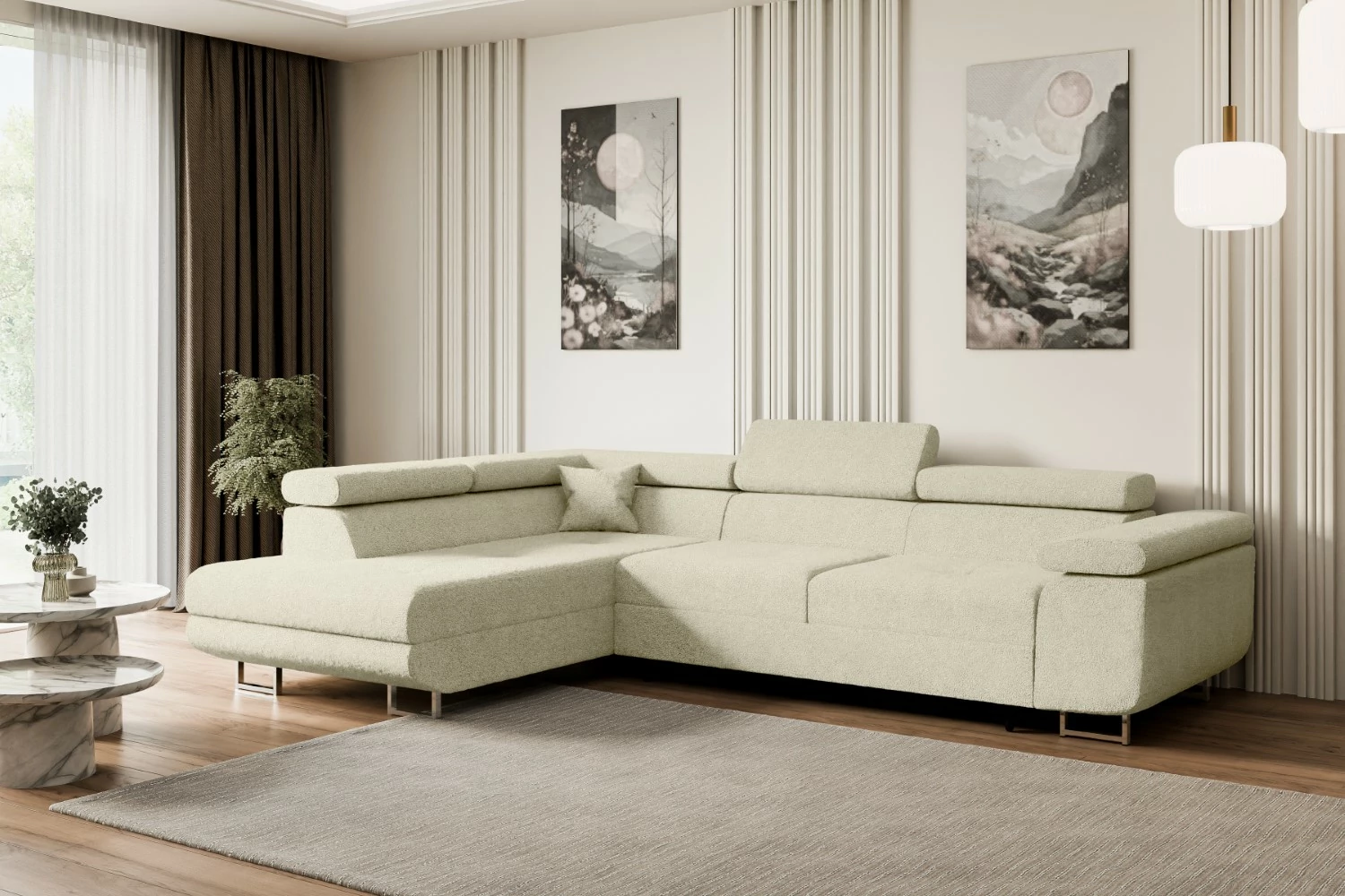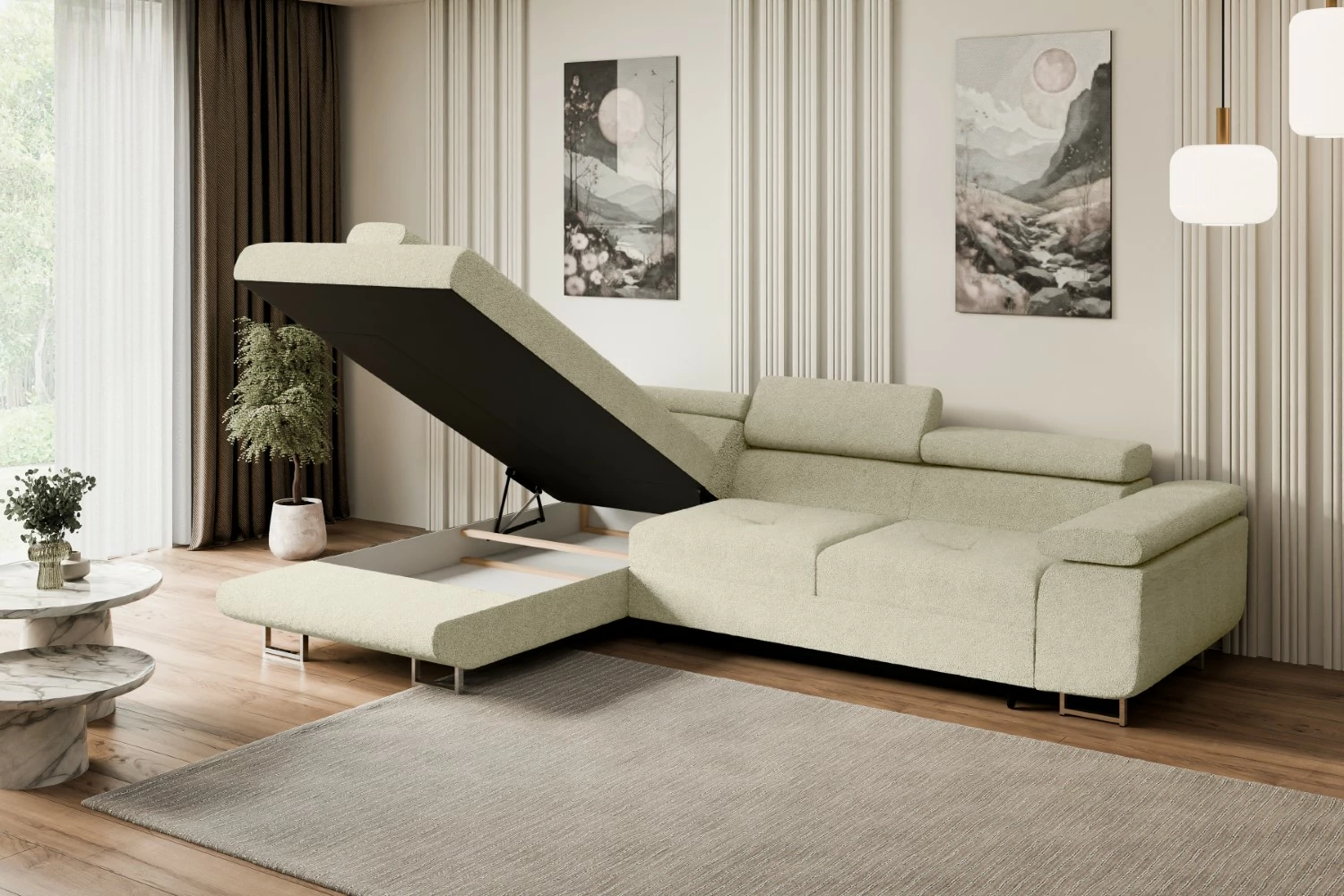 Dank der bequemen Kissen ist das Sofa ideal, um entspannte Stunden mit Familie oder Freunden zu genießen. Eine robuste Grundlage aus Möbelplatte und Massivholz garantiert die notwendige Stabilität des gesamten Möbelstücks. Die gemütliche Eckschlafsofa ist mit einem praktischen Bettkasten ausgestattet, perfekt zum Verstauen von Bettwäsche oder Decken – so bleibt Ihr Wohnzimmer stets ordentlich und aufgeräumt.