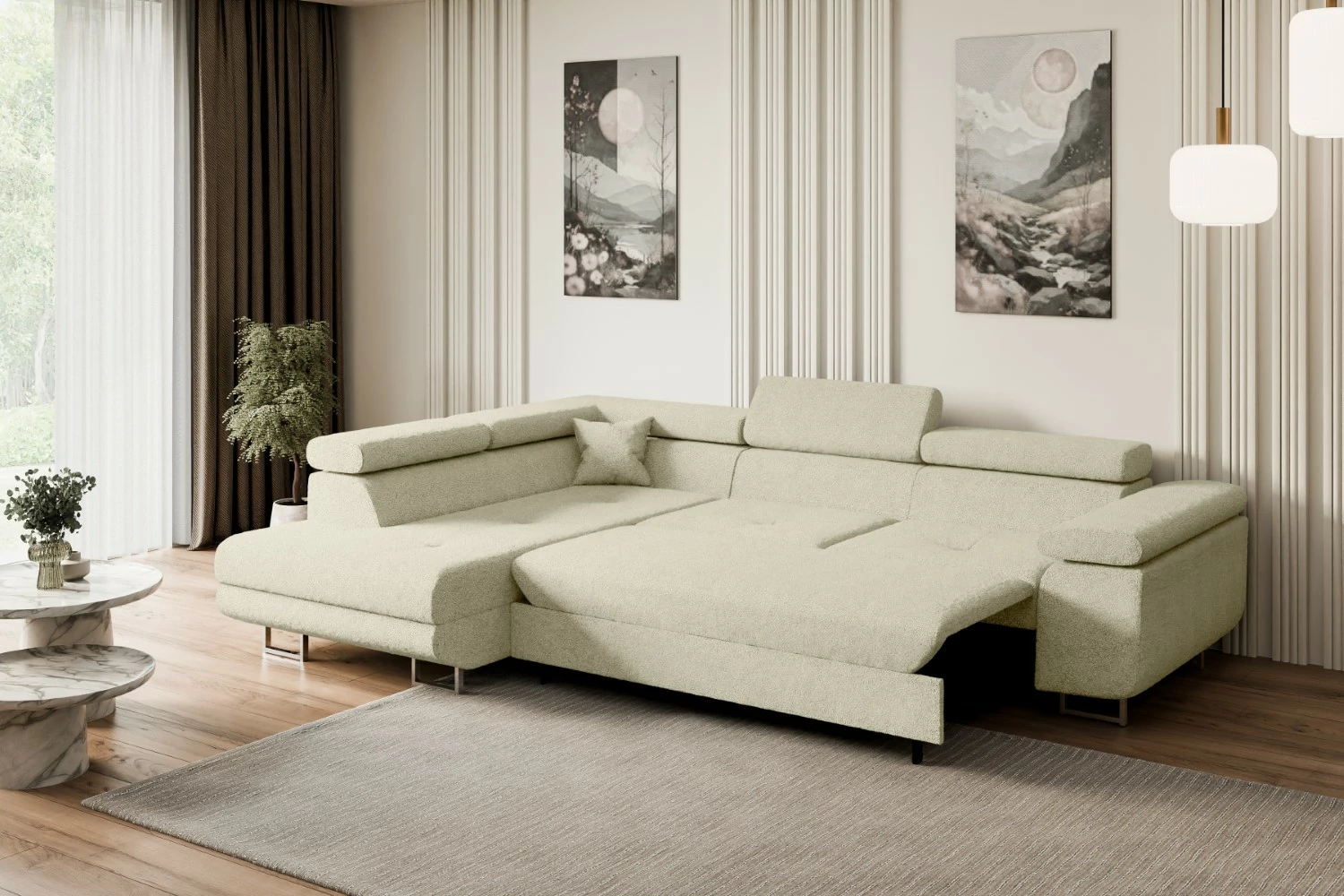Dieses ausziehbares Eckschlafsofa für Ihr Zuhause überzeugt durch hochwertige Verarbeitung und durchdachte Technik. Der solide Auszugsmechanismus verwandelt das Sofa im Handumdrehen in ein komfortables Polstersofa-Gästebett. Perfekt für spontanen Besuch, gemütliche Filmabende oder den täglichen Einsatz als Schlafcouch.