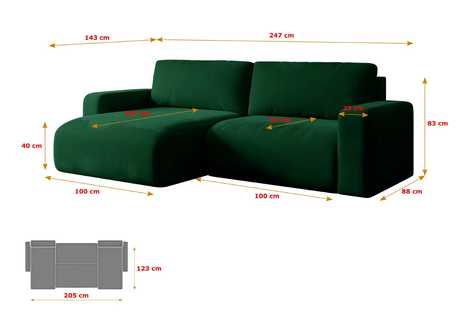 Dank der bequemen Kissen ist das Sofa ideal, um entspannte Stunden mit Familie oder Freunden zu genießen. Eine robuste Grundlage aus Möbelplatte und Massivholz garantiert die notwendige Stabilität des gesamten Möbelstücks. Die gemütliche Eckschlafsofa ist mit einem praktischen Bettkasten ausgestattet, perfekt zum Verstauen von Bettwäsche oder Decken – so bleibt Ihr Wohnzimmer stets ordentlich und aufgeräumt.