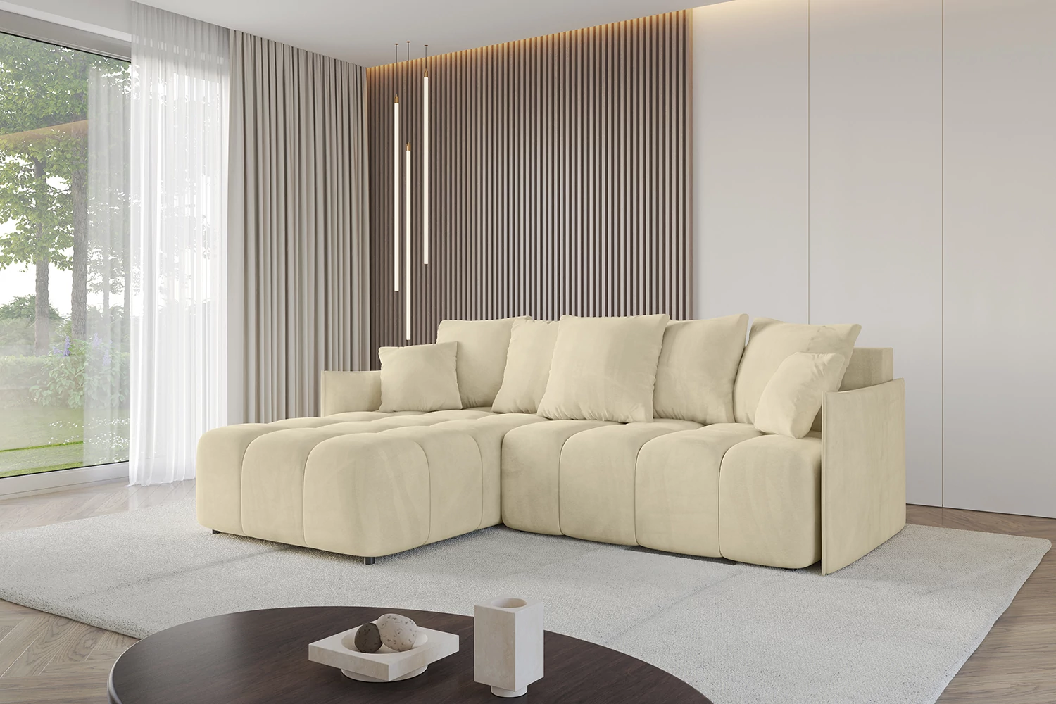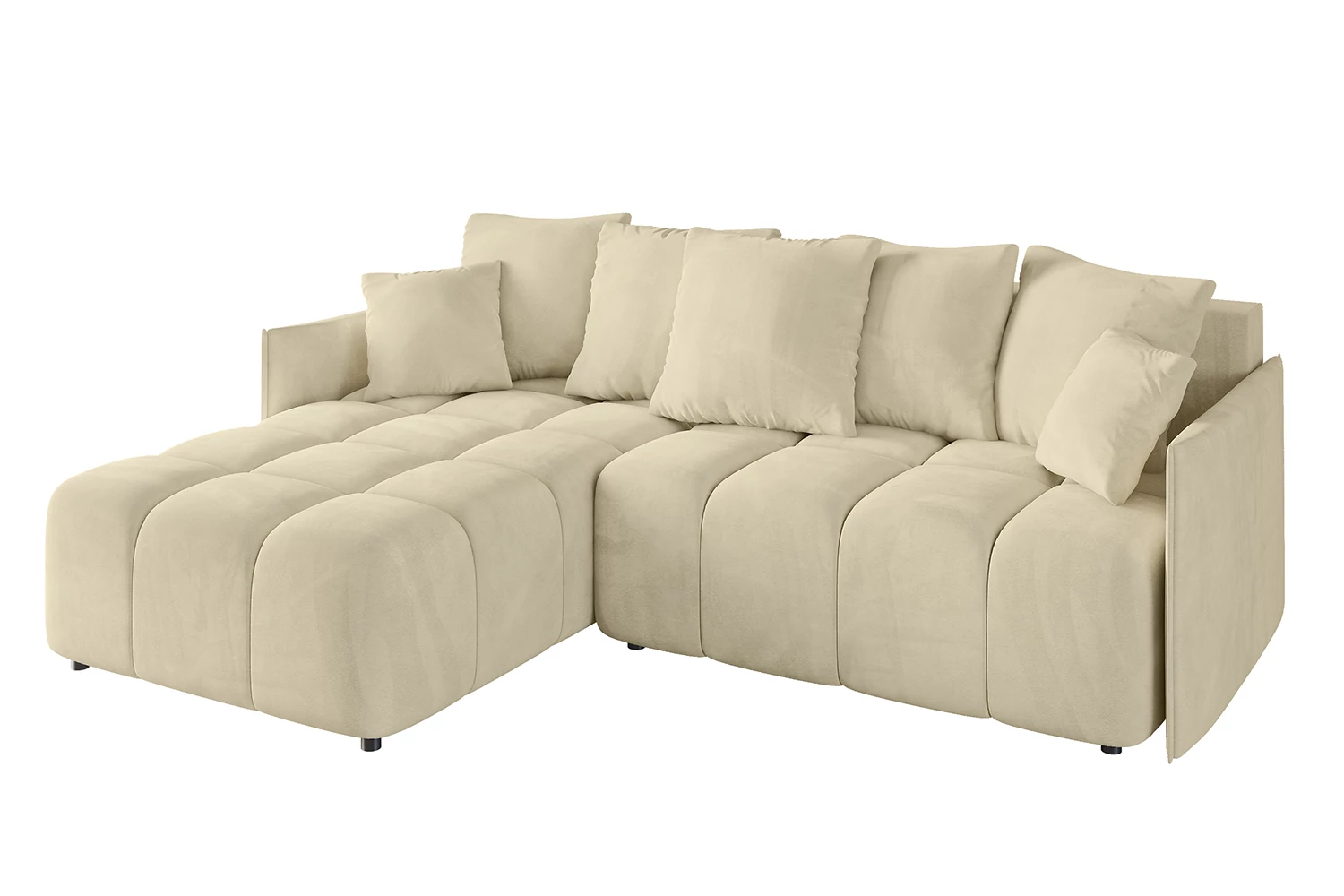 Dank der bequemen Kissen ist das Sofa ideal, um entspannte Stunden mit Familie oder Freunden zu genießen. Eine robuste Grundlage aus Möbelplatte und Massivholz garantiert die notwendige Stabilität des gesamten Möbelstücks. Die gemütliche Eckschlafsofa ist mit einem praktischen Bettkasten ausgestattet, perfekt zum Verstauen von Bettwäsche oder Decken – so bleibt Ihr Wohnzimmer stets ordentlich und aufgeräumt.