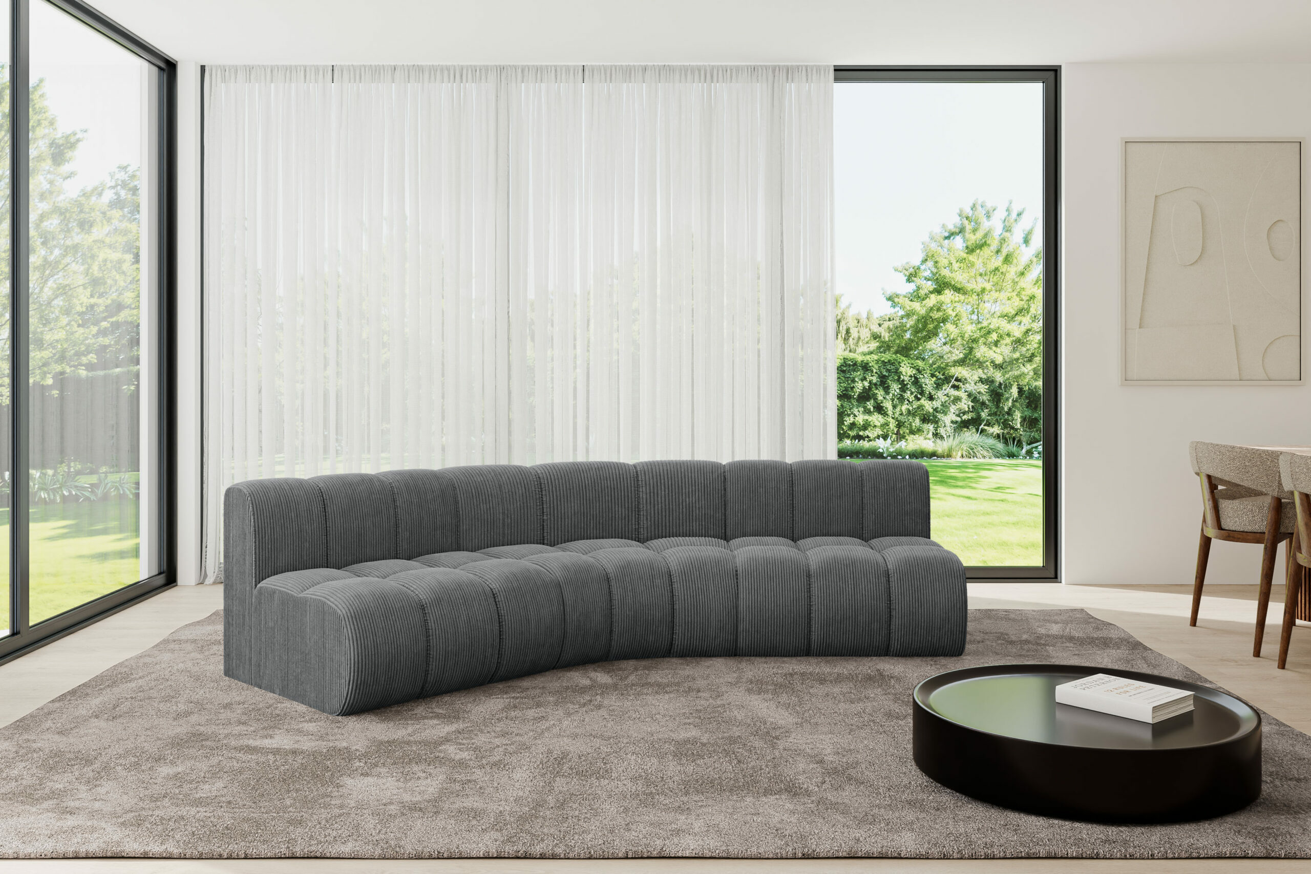 Der hochwertige Bezugsstoff überzeugt durch seine angenehme Haptik, Pflegeleichtigkeit und Strapazierfähigkeit – perfekt für den Alltag. Die rundum bezogene Rückenfläche ermöglicht eine freie Platzierung im Raum und macht das Sofa auch als Raumteiler zu einem echten Blickfang.