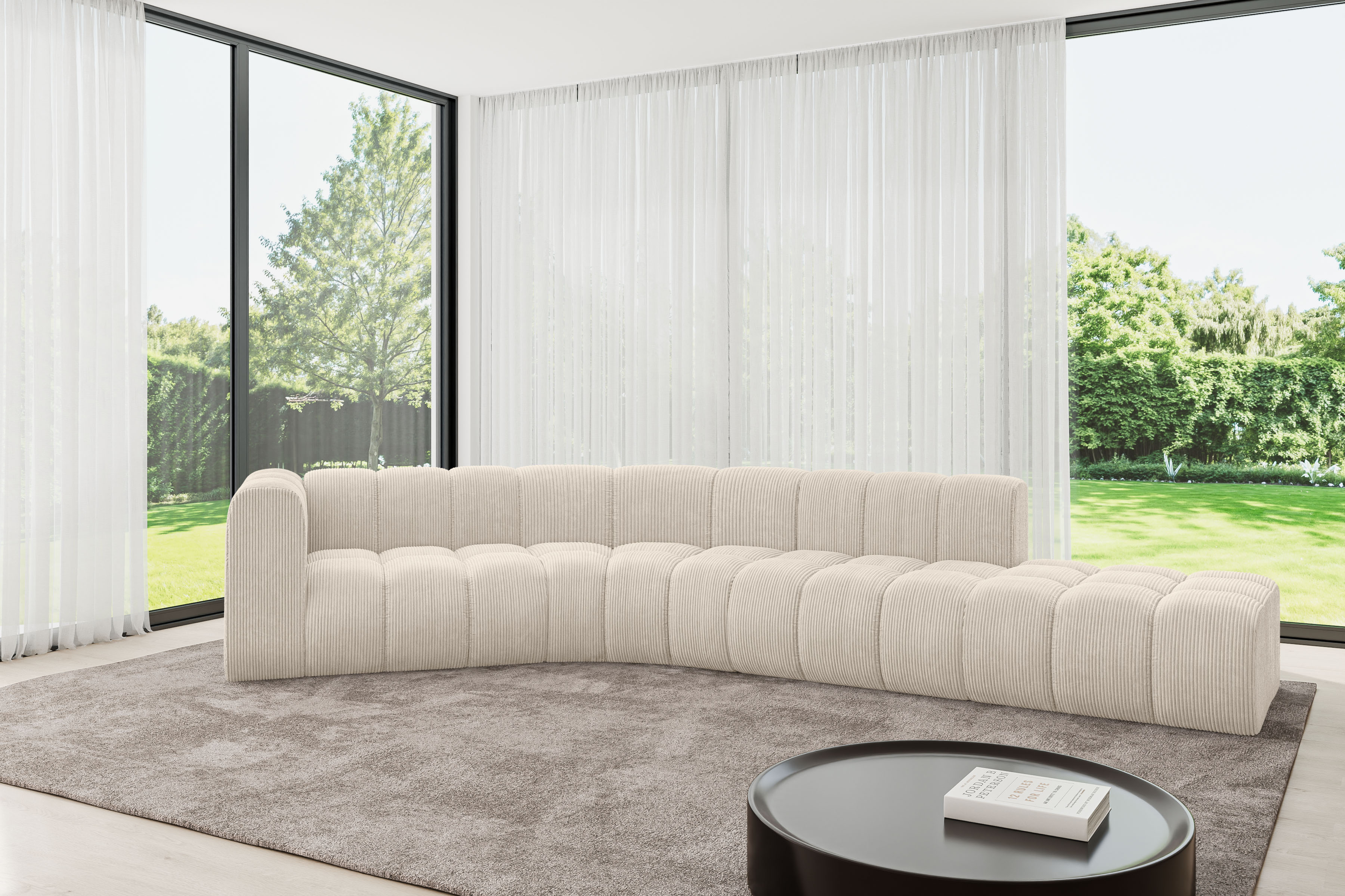 Der hochwertige Bezugsstoff überzeugt durch seine angenehme Haptik, Pflegeleichtigkeit und Strapazierfähigkeit – perfekt für den Alltag. Die rundum bezogene Rückenfläche ermöglicht eine freie Platzierung im Raum und macht das Sofa auch als Raumteiler zu einem echten Blickfang.