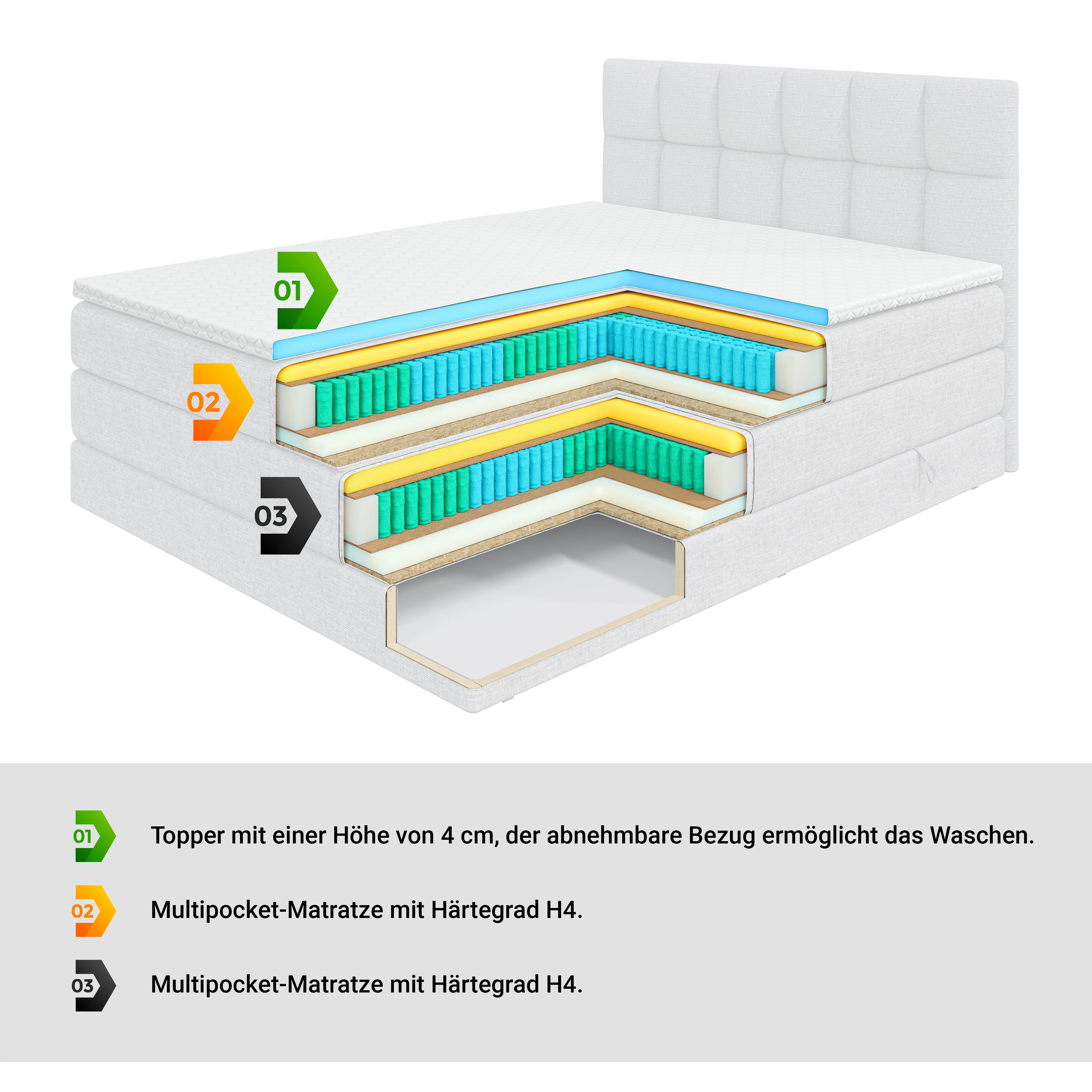 Das Boxspringbett ist mit zwei 19 cm hohen H4-Multipocket-Matratzen ausgestattet. Die Matratzen verfügen über Taschenfederung mit 780 Federn/m², PUR-Schaumstoff T30 und eine Kokosfasermatte. Der Härtegrad H4 bietet ein eher festes Liegegefühl und eignet sich besonders für Personen, die eine stabilere Liegefläche bevorzugen.