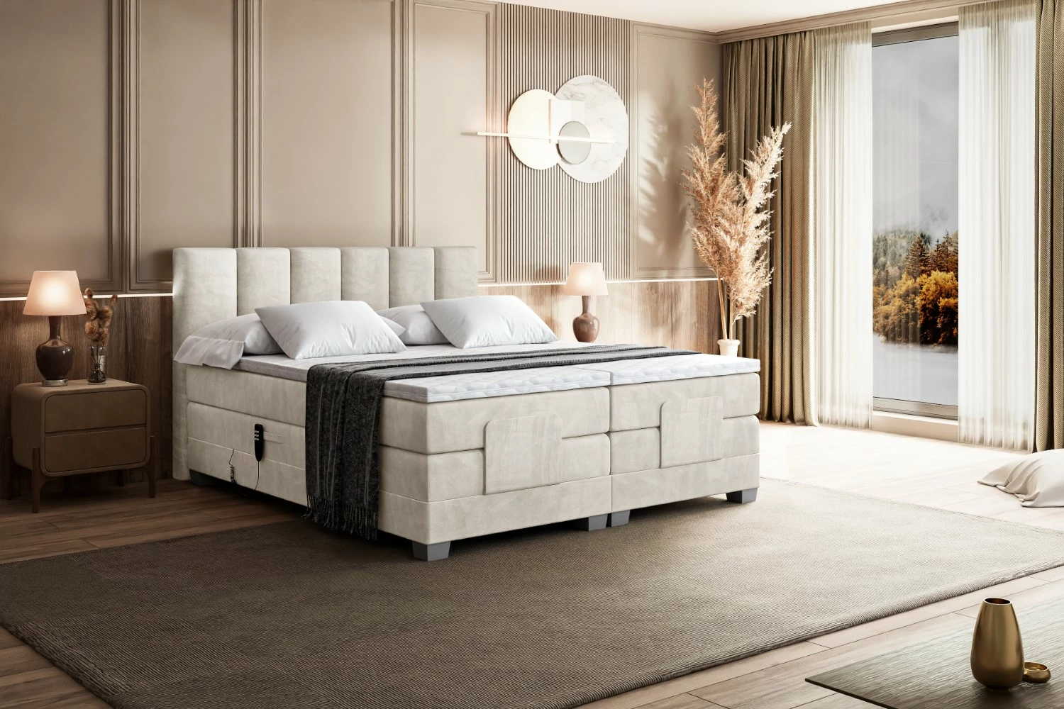 Das elektrisch verstellbare Boxspringbett verbindet modernen Schlafkomfort mit einer eleganten, gepolsterten Optik. Das hohe, weich gepolsterte Kopfteil verleiht dem Bett ein stilvolles Erscheinungsbild und sorgt für eine gemütliche Atmosphäre im Schlafzimmer.