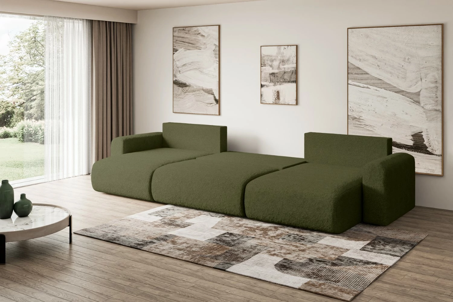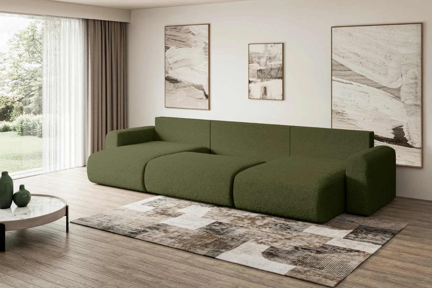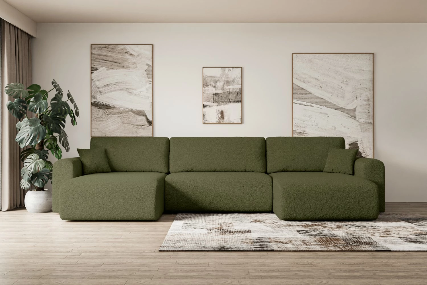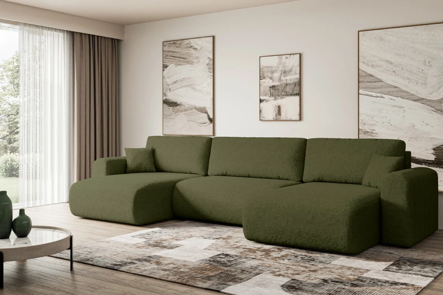 Eine moderne Wohnlandschaft mit Schlaffunktion ist ein vielseitiges Möbelstück für jedes Zuhause. Unsere stilvolle Wohnlandschaft kombiniert Funktionalität mit Ästhetik und bietet höchsten Komfort beim Sitzen, Liegen und Schlafen. Die großzügige U-Form ist ideal für weitläufige Wohnbereiche und schafft eine luxuriöse Atmosphäre für jede Gelegenheit. Diese Schlafcouch bietet reichlich Platz für die ganze Familie und verwandelt sich bei Bedarf schnell in ein komfortables Gästebett.