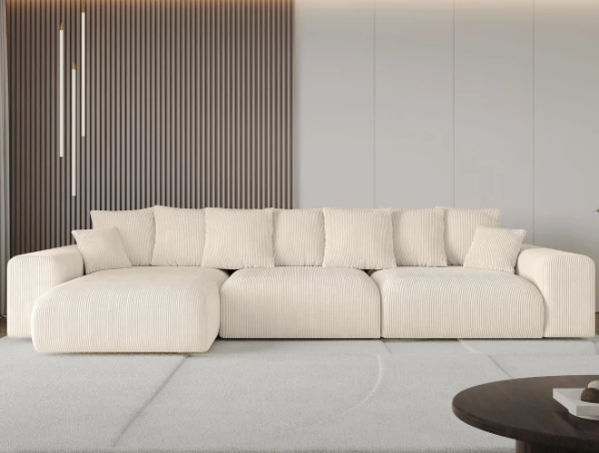 Beispiel: Ecksofa ESKAR-L2, Stoff: Beige – Poso 105 (Zusammensetzung: 92% PES 8% NY, Pilling-Resistenz: 4, OEKO-TEX® STANDARD 100)
